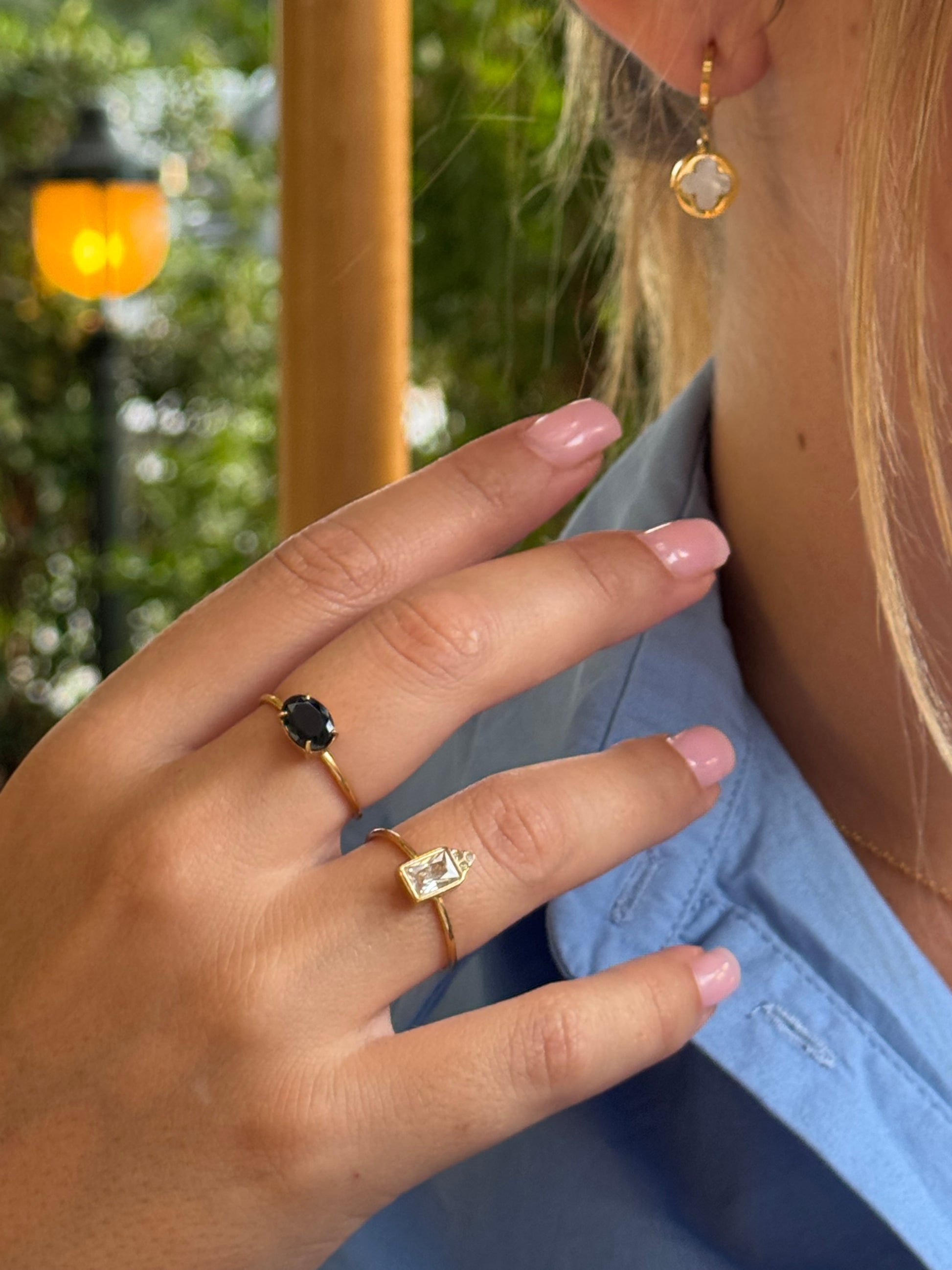 - Design : Pierre noire centrale sur monture dorée, contraste élégant