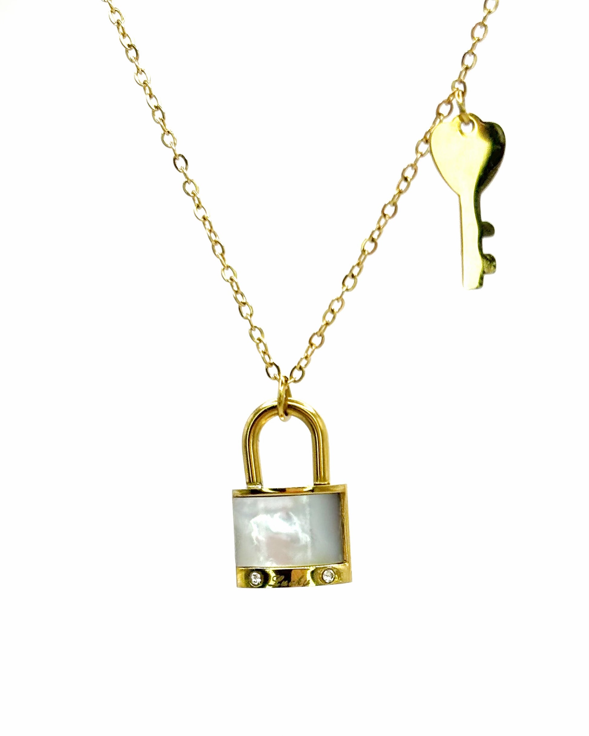 Son design unique met en valeur une chaîne délicate ornée en son centre d’un cadenas blanc, subtilement encadré de doré, symbole de sécurité et de protection. Légèrement décalée, une clé dorée vient compléter le pendentif, évoquant l’ouverture, la liberté et la découverte de nouvelles possibilités.